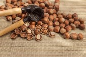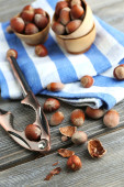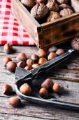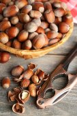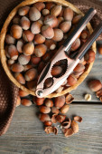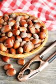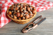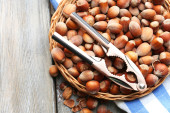 Orzechy laskowe w wiklinowym koszu na drewniane tła
