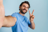 młody brunetka człowiek w słuchawki wskazując palce w aparat odizolowany na niebieskim tle