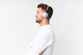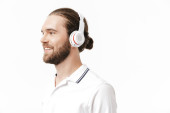 młody brunetka człowiek z włosia słuchanie muzyki ze słuchawki izolowane na niebieskim tle