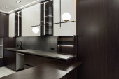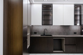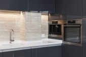 nowa czysta kuchnia z czarnym zlewem metalowy kran i fasady