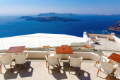 Taras słoneczny z drewnianym stołem i krzesłami w Thira, wyspa Santorini, Grecja. Piękne miejsce na odpoczynek nad kalderą.