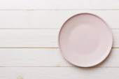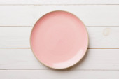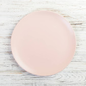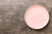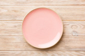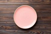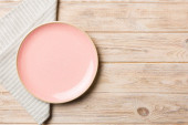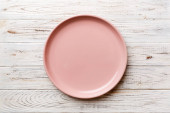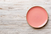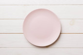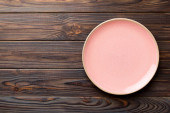 Widok z góry pusty różowy talerz na drewnianym tle. Puste miejsce na projekt.