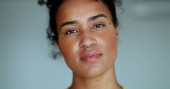 czarny afrykański kobieta dostosowanie włosy patrząc w aparat