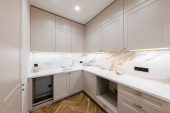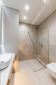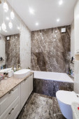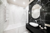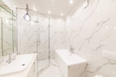Zdjęcie "Nowoczesny wystrój wnętrz łazienki. Białe meble i wanna" może być wykorzystywane do celów osobistych i komercyjnych zgodnie z warunkami zakupionej licencji Royalty-free. Obraz jest dostępny do pobrania w jakości wysokiej rozdzielczości do 5760x3840.