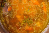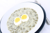 Zupa jęczmienna podawana w wydrążonym chlebie z jajkiem, rzeżucha