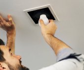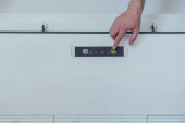 Biznesmen wpisuje kod blokady hasła palca na panelu alarmowym, na białej ścianie, widok z tyłu człowieka z brodą