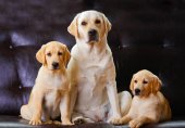 Mum and dad golden retriever dogs with their puppy laying together on the black backround.