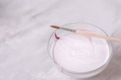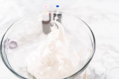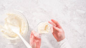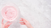 Mieszanie w lukrze maślanym kupionym w sklepie w szklanej misce do mieszania.