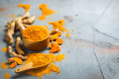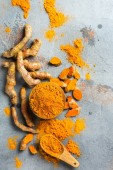 kurkuma w proszku w łyżce z korzeniem kurkumy. kurkuma lub kurkumina na konkretnym tle. Przyprawa, naturalne zabarwienie, medycyna alternatywna. Długi sztandar. widok z góry.