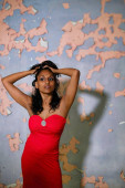 piękny model pochodzenia indyjskiego stanowi bardzo zmysłową sesję zdjęciową, w bieliźnie i szlafroku