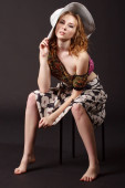 Niezadowolony pin up kobieta pozowanie z skrzyżowanymi ramionami na różowym tle