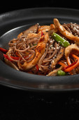 Funchoza z wołowiną i warzywami na czarnym tle, przestrzeń kopiowania. Makaron szklany, Tradycyjne azjatyckie jedzenie, Makaron smażyć lub makaron wok w czarnej misce z gorącą parą, Widok z góry