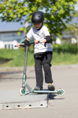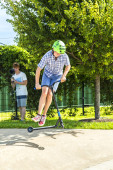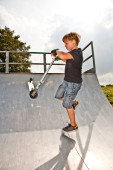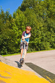 chłopiec ma zabawa scooting w scating w skateparku