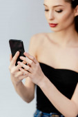 wesoła kobieta w bezprzewodowej słuchawce i za pomocą smartfona w parku
