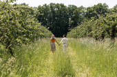 szczęśliwa młoda kobieta ze smartfonem spacerującym w zielonym parku