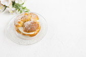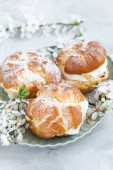 Choux Bułeczki z bitą śmietaną i cukrem w proszku na górze. Choux ciasto deser. Francuskie ptysie