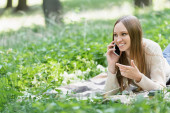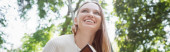 radosna kobieta w okularach rozmawiająca na smartfonie w zielonym parku, baner