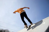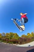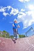 chłopiec skacze ze skutera na kręgosłup w skate parku i
