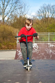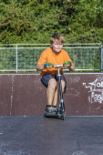 chłopiec jeździ skuterem w skate parku