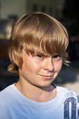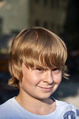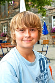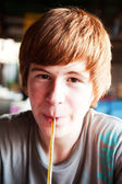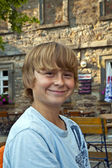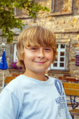 portret szczęśliwy uśmiechający się chłopak siedzi w restaurację na świeżym powietrzu