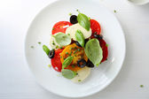 Sałatka z filetem rybnym, pomarańczą, oliwkami, szpinakiem i krewetkami. Zdrowe jedzenie. Zdjęcie do menu.