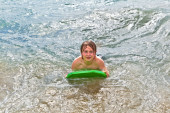ładny chłopak ma zabawy w krystalicznie czysty ocean