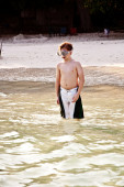 ładny chłopak ma zabawy w krystalicznie czysty ocean