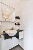 Zdjęcie "Wnętrze łazienki wykończone ceramicznymi czarno-białymi płytkami" może być wykorzystywane do celów osobistych i komercyjnych zgodnie z warunkami zakupionej licencji Royalty-free. Obraz jest dostępny do pobrania w jakości wysokiej rozdzielczości do 5760x3840.