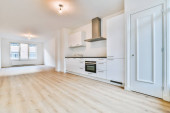 Zdjęcie "Przestronny pusty pokój z aneksem kuchennym" może być wykorzystywane do celów osobistych i komercyjnych zgodnie z warunkami zakupionej licencji Royalty-free. Obraz jest dostępny do pobrania w jakości wysokiej rozdzielczości do 5760x3840.