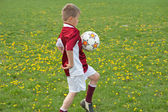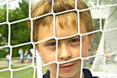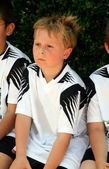 chłopiec exausted trwa odpoczynku w meczu piłki nożnej
