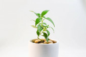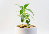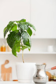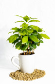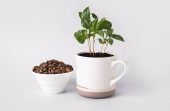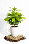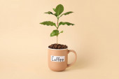 Piękne drzewo kawy w filiżance i fasoli na tle koloru