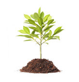 Młode drzewo kawy i gleby na białym tle