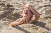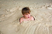 chłopiec jest kopanie siebie do piaszczystej plaży i jest dużo zabawy