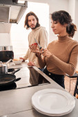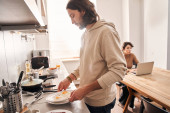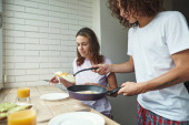 mężczyzna wprowadzenie smażone jajka w talerzu dziewczyna