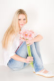 romantyczna kobieta trzymać gerbera różowy stokrotka