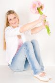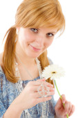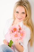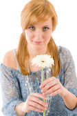 romantyczna kobieta trzymać gerbera różowy stokrotka kwiat