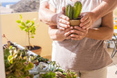 Zdjęcie "Dorosła kobieta w działalności ogrodniczej poza domem na tarasie. Kobiety opiekujące się roślinami dla środowiska i koncepcji ekologicznego stylu życia. Szczęśliwa pani odrasta rośliny na zewnątrz" może być wykorzystywane do celów osobistych i komercyjnych zgodnie z warunkami zakupionej licencji Royalty-free. Obraz jest dostępny do pobrania w jakości wysokiej rozdzielczości do 5760x3840.