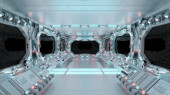 Futurystyczny korytarz wewnętrzny Hdri z białymi neonami na ścianach paneli. 360 stopni panoramiczny widok trójkątnego tła statku kosmicznego w stacji kosmicznej. Projekcja Vr tunelu neonowych świateł w stylu piramidy z oświetloną ścieżką. Równoważny prostokątny Cyber ro