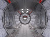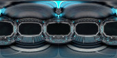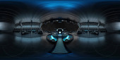 Zdjęcie "Futurystyczny korytarz wewnętrzny Hdri z białymi neonami na ścianach paneli. 360 stopni panoramiczny widok trójkątnego tła statku kosmicznego w stacji kosmicznej. Projekcja Vr tunelu neonowych świateł w stylu piramidy z oświetloną ścieżką. Równoważny prostokątny Cyber ro" może być wykorzystywane do celów osobistych i komercyjnych zgodnie z warunkami zakupionej licencji Royalty-free. Obraz jest dostępny do pobrania w jakości wysokiej rozdzielczości do 5760x3840.