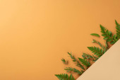 Widok z góry pionowe zdjęcie ceramicznego wazonu z eukaliptusem na odizolowanym pastelowym pomarańczowym tle z przestrzenią do kopiowania