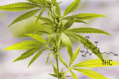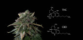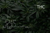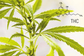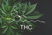 Formuła chemiczna THC marihuany. Tetrahydrokanabinol. Konopie indyjskie izolowane na białym tle. Układ świeżych mokrych liści marihuany, krzew wodny