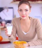 Szczęśliwa młoda kobieta o zdrowe śniadanie w kuchni