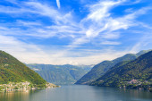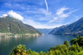 Krajobraz jeziora Como. Widok na wioskę Cernobbio, Włochy