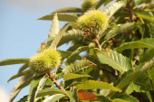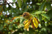 kasztan na drzewie przed dojrzewaniem owoców w październiku. Koncepcja jesieni.