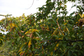 kasztan na drzewie przed dojrzewaniem owoców w październiku. Koncepcja jesieni.