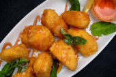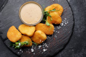 Nuggetsy z serem. mięta i dżem, na talerzu, na ciemnym tle