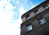 Zniszczony wieżowiec w Charkowie po ostrzale wojsk rosyjskich. Czarno-białe zdjęcie z wojny.