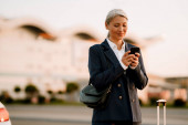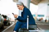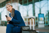 Szary azjatycki kobieta za pomocą telefonu komórkowego i picia kawy na lotnisku na zewnątrz