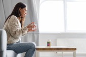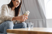 Dojrzałe Azji kobieta biorąc jej leki podczas siedzieć na kanapie w domu