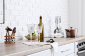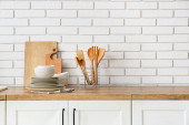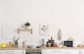 Zlewozmywak z pięknymi kwiatami i naczyniami kuchennymi na blacie w pobliżu ściany z białej cegły